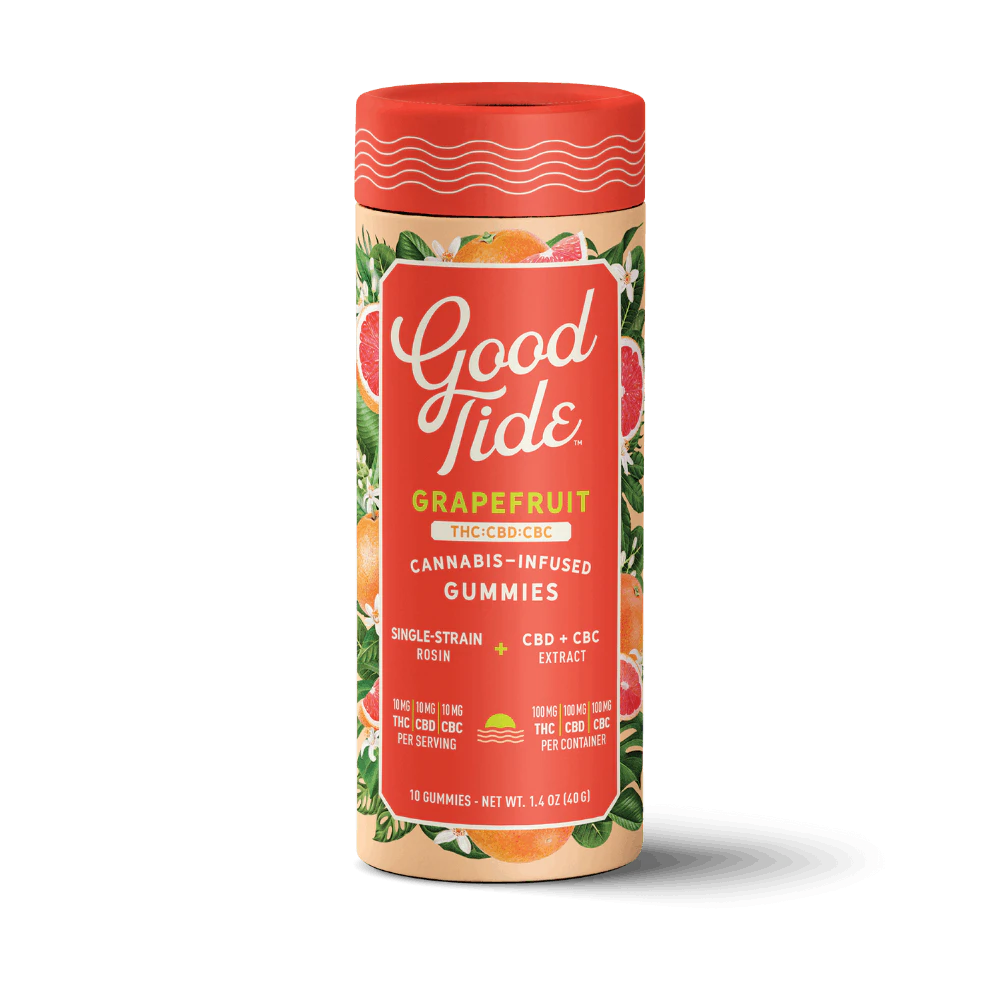 1:1:1 THC:CBD:CBC Good Tide Grapefruit THC:CBD:CBC gummies pair a Sativa single-strain rosin with the mood-boosting effects of CBC for citrusy, decadent treat that will have you feeling your very best with every bite. Get a front row seat to bliss.