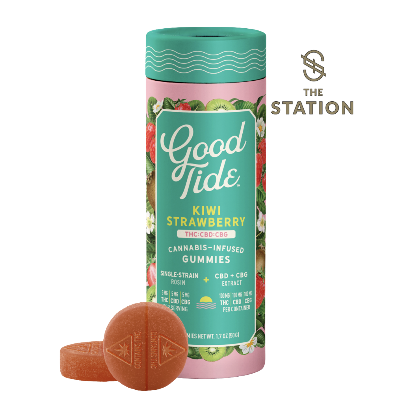 Lean into relaxation and recovery with Good Tide Kiwi Strawberry THC:CBD:CBG gummies. Hybrid single-strain rosin along with an extra boost of CBG are wrapped up with juicy kiwi strawberry flavors to help you fully reset.