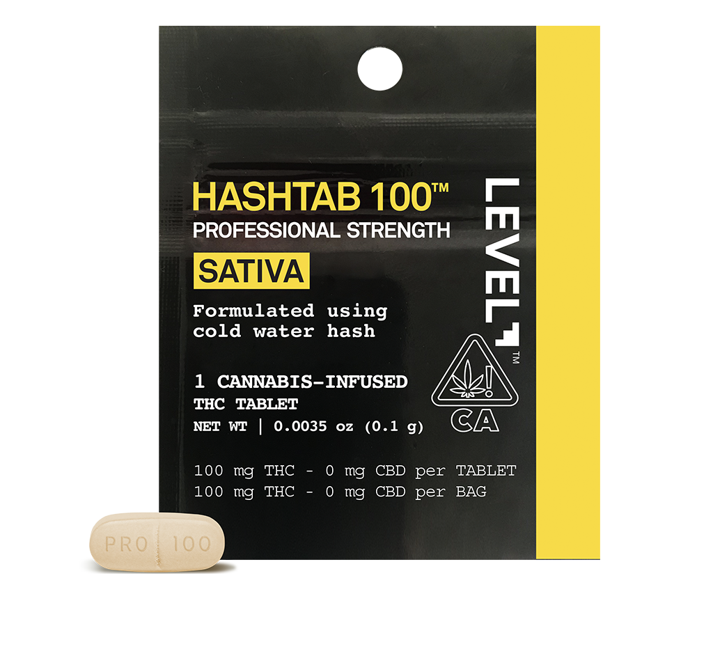 Our classic hash high is also available in a 100 mg single pack. The LEVEL Sativa Hashtab 100 single pack contains one 100 mg professional-strength swallowable cold water hash tablet that takes effect in 30โ90 minutes, with a duration of 3โ6 hours. Should you wish to consume a lighter dose, the tablets are scored so you can easily split each tablet in half.
