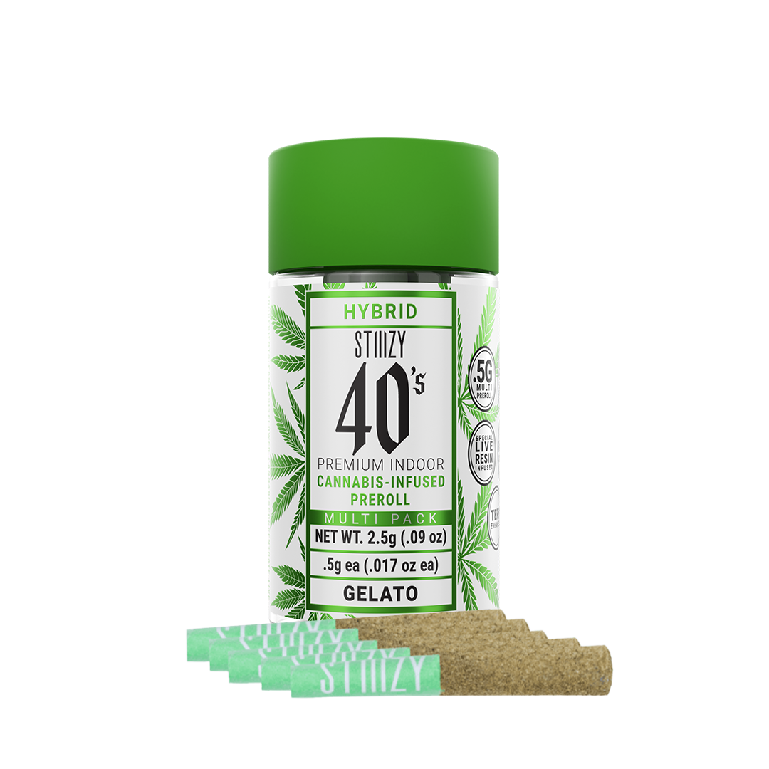 Elevate your pre-roll game. Stiiizy 40s pre-rolls are setting the standard with high potency, cannabis infused joints coated evenly with kief. Using our proprietary live resin infusion methods, weβve designed every pre-roll to offer 40%+ THC potency with a unique flavor profile. With a smooth inhale and tasteful exhale, each and every Stiiizy 40 is packed with indoor grown flower, specifically made to ensure a potent and long-lasting high. Spark up the 40s. This smooth and sweet strain delivers a heavy dose of relaxation. Relaxed, Happy, Euphoric.