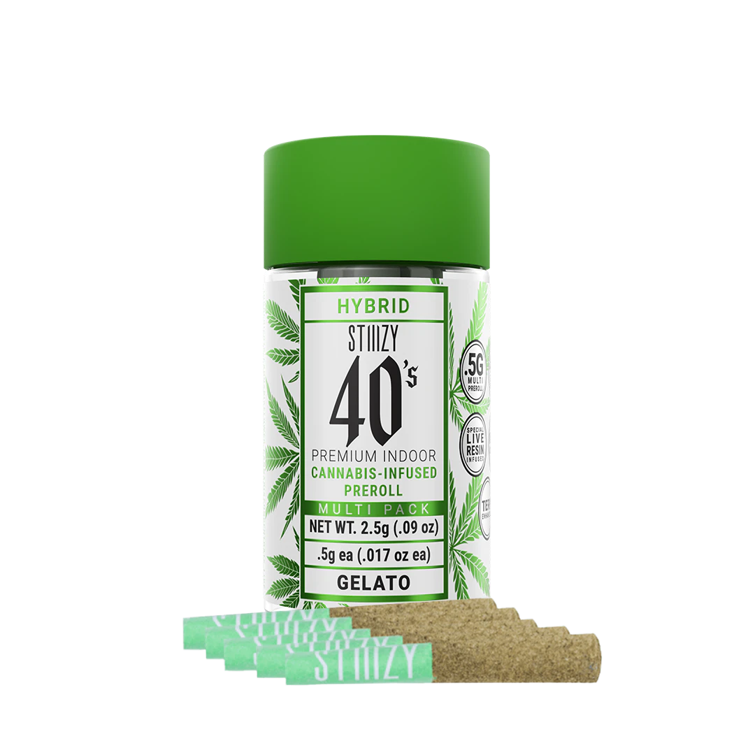 Elevate your pre-roll game. Stiiizy 40s pre-rolls are setting the standard with high potency, cannabis infused joints coated evenly with kief. Using our proprietary live resin infusion methods, we’ve designed every pre-roll to offer 40%+ THC potency with a unique flavor profile. With a smooth inhale and tasteful exhale, each and every Stiiizy 40 is packed with indoor grown flower, specifically made to ensure a potent and long-lasting high. Spark up the 40s. This smooth and sweet strain delivers a heavy dose of relaxation. Relaxed, Happy, Euphoric.