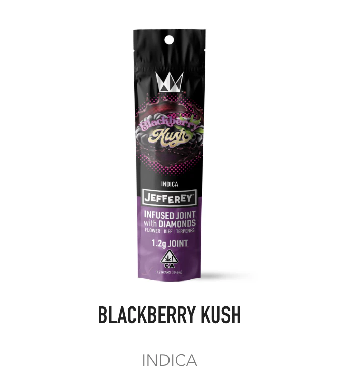 The Jefferey Blackberry Kush Infused single is an Indica-leaning Jay with diffused effects. Helping the overtaxed consumer to “Keep Calm and Carry On,” the “Blackberry Kush” Jefferey is crafted from meticulously grown Premium Flower, packed with Live Resin Diamonds, sprinkled with kief from our Top Shelf Flower, and coated with a subtle layer of all-natural terpenes. Eat, drink, and be Berry, the effects from this 1.2G infused joint instills a laid-back summer-like vibe.